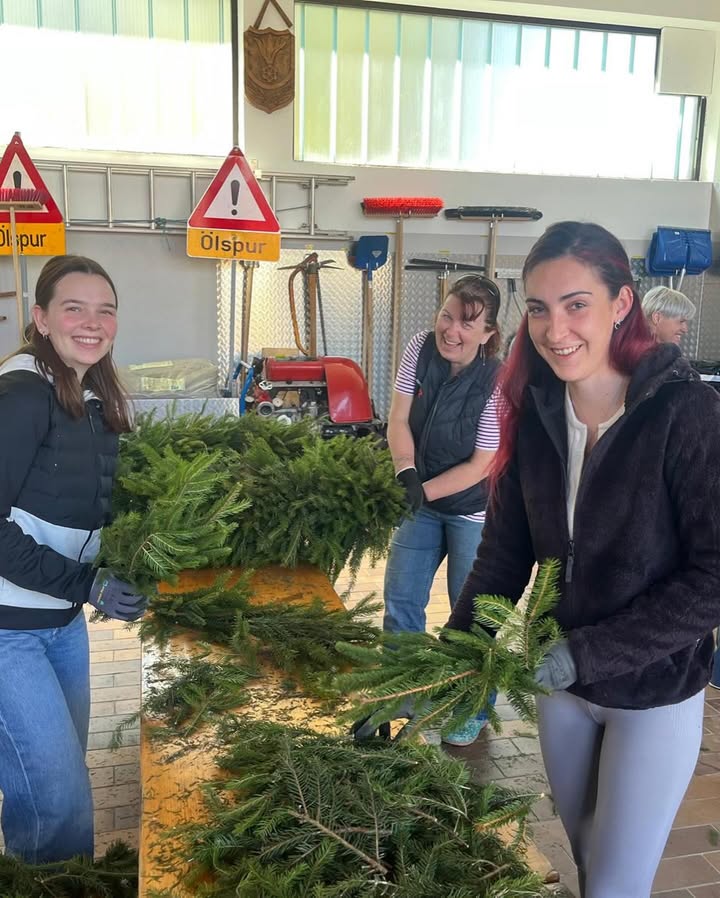 Am Freitag haben wir gemeinsam die Kränze für unseren Maibaum gebunden.